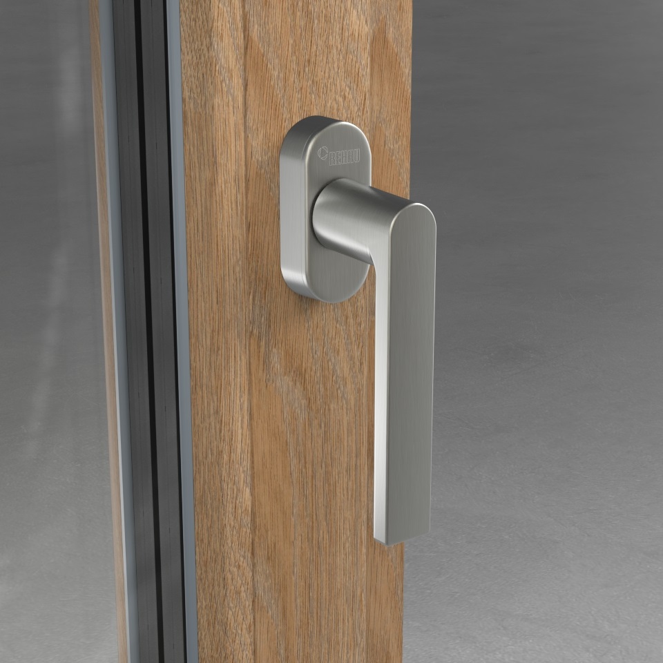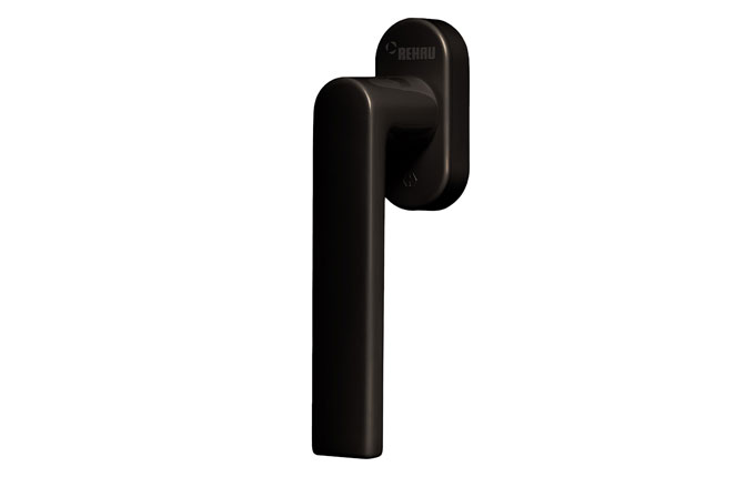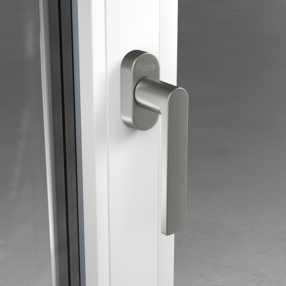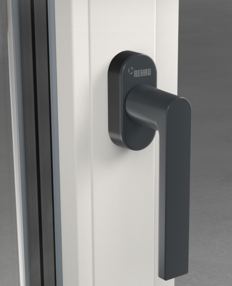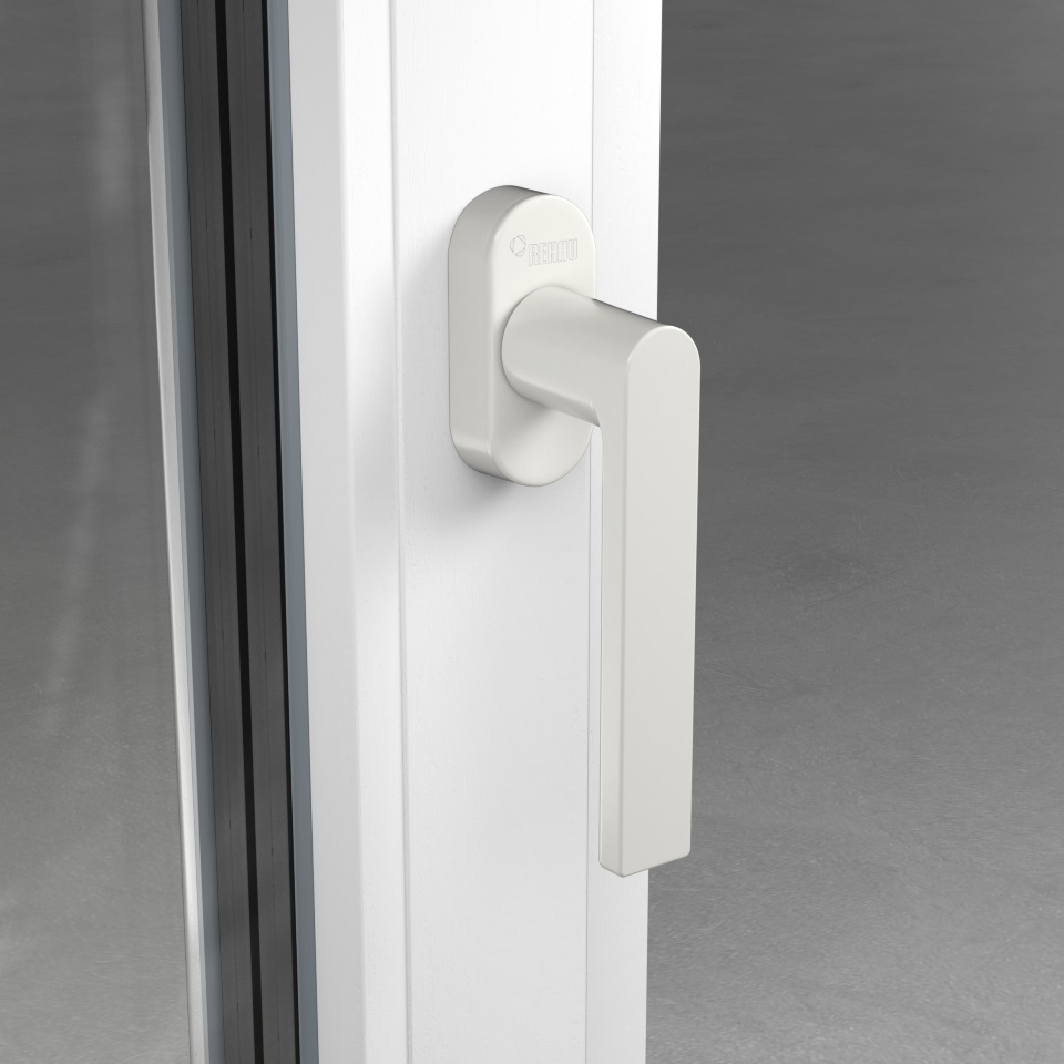 Fenstergriff im exklusiven REHAU Design mit Secustik® Technik als Sperrmechanismus gegen Einbruchversuch und VarioFit® mit längenvariablen Vierkanststift zu flexiblen Montage an Fenstersystemen mit 60, 70 und 80 mm Bautiefen