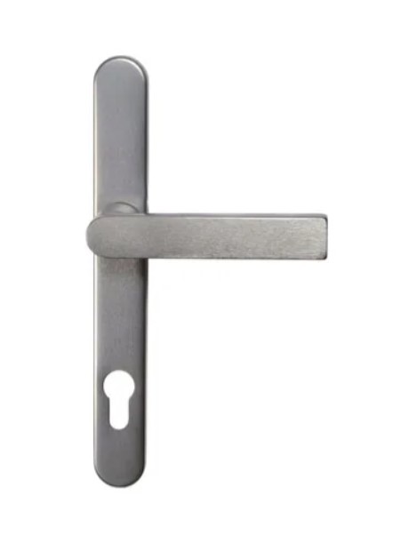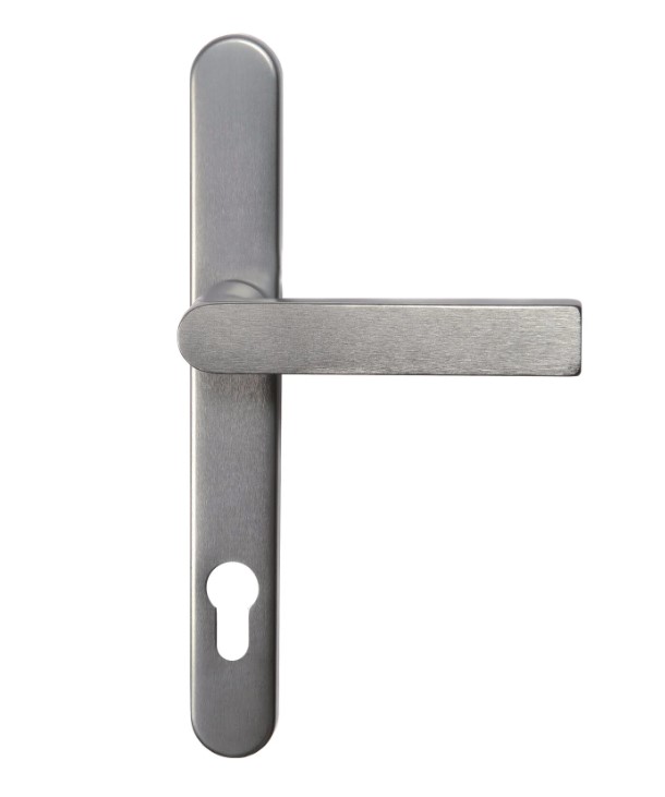 Türgriffgarnitur im exklusiven REHAU Design als passender Türgriff zu den Fenstergriffen. Die schmale Schildform ergänzt mit der Griffform der Fenstergriffe ergibt eine einheitliche Gestaltung Ihrer Tür- und Fensterelemente zum eleganten und hochwertigen Gesamteindruck